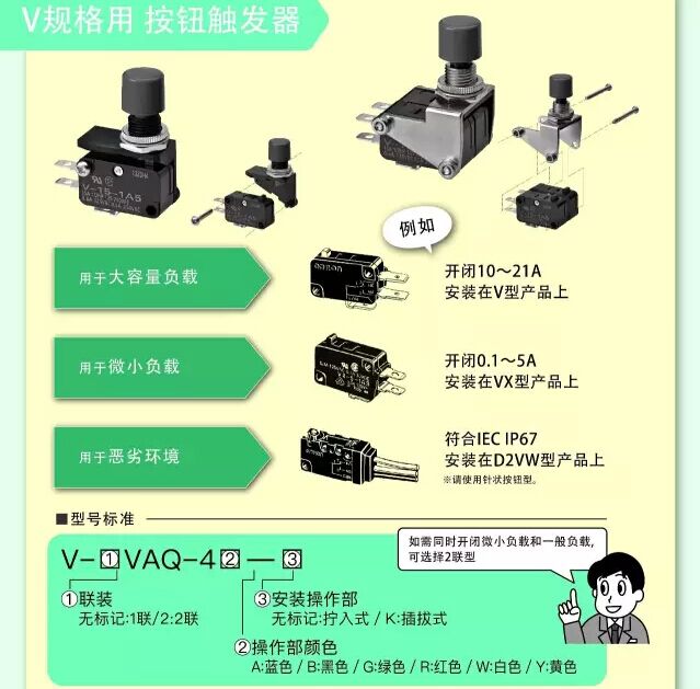 1、歐姆龍微動開關升級為單觸式操作開關,用于微動開關通用附件的V規格/S規格,新增按鈕觸發器系列