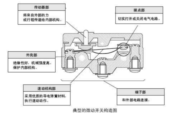 微動開關具有微小接點間隔和速動機構,用規(guī)定的行程和力進行開關動作的接點機構,被外殼覆蓋, 其外部有傳動器,且外形較小。下圖為典型的微動開關構造的一個示例。