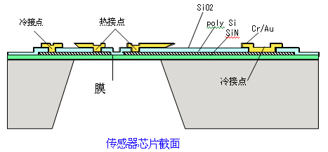 利用賽貝克效應(2種不同金屬接點間的溫度差而產(chǎn)生的溫差電動勢)。使用n型Poly Si、p型Poly Si作為材料進行熱電對接形成熱電堆。在熱絕緣性良好的介電薄膜上加載熱接點,在熱傳導性良好的硅材料上加載冷接點,通過高速對應實現(xiàn)高功率的能量轉(zhuǎn)換(紅外線—溫度--溫差電動勢)。