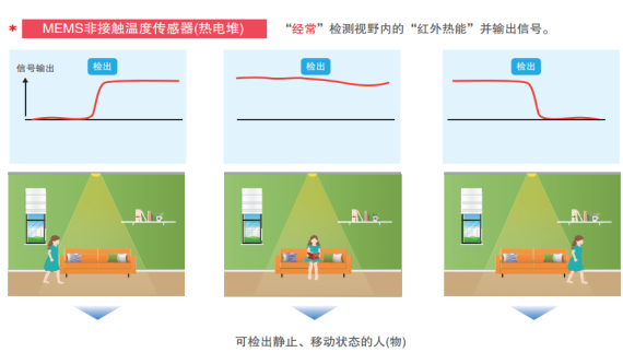 與只能檢測(cè)動(dòng)態(tài)物體的熱釋電紅外傳感器,歐姆龍D6T傳感器不僅能檢測(cè)動(dòng)態(tài)物體,也能檢測(cè)靜止物體,實(shí)現(xiàn)即時(shí)檢測(cè)物體的溫度變化。