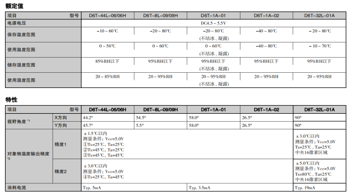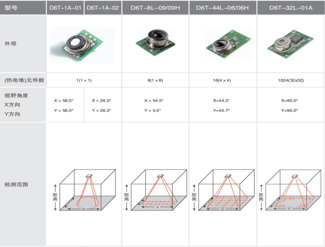 非接觸溫度傳感器D6T系列的選型參數: