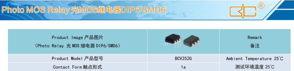 (Relay 光MOS 繼電器 DIP6/SMD6),Product Model產品型號:BCV252G,Contact Form 觸點形式:1a,Ambient Temperature 25C測試環境溫度 25°C