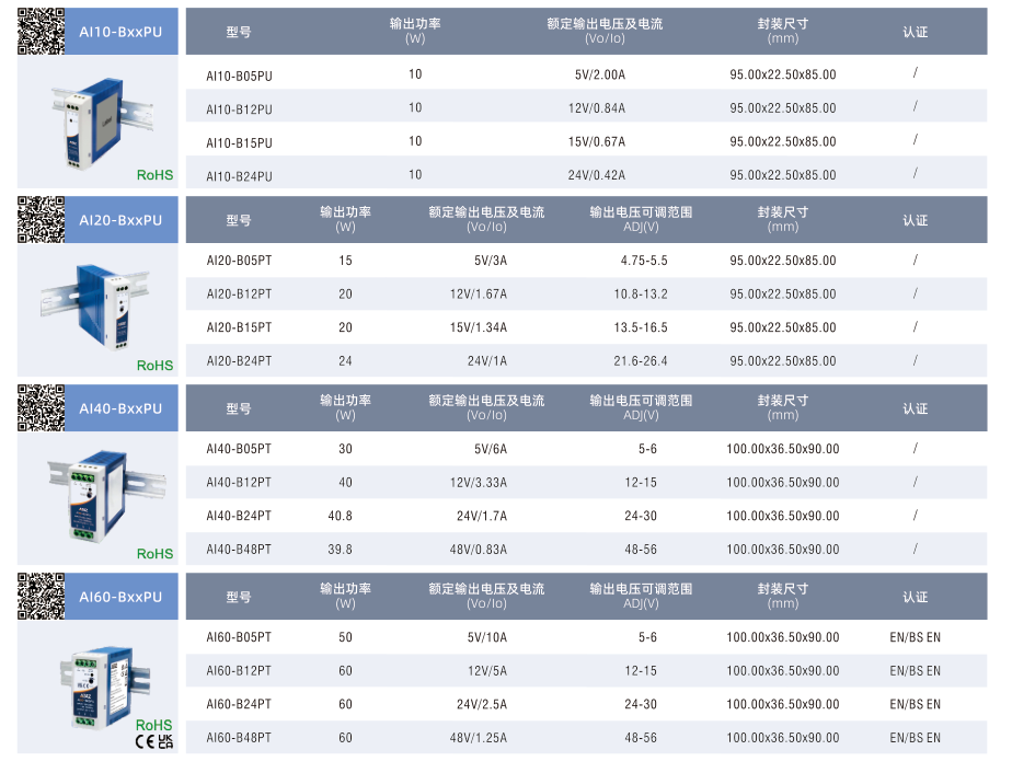 開關電源A110/20/40/60-BxxPU, ?寬輸入電壓范圍:85-264VAC/120-370VDC ?交直流兩用(同一端子輸入電壓) ?工作溫度范圍:-30°Cto +70℃℃ ?效率最高可達90% ?4000VAC高隔離電壓 ?DCOK功能 ?滿足5000m海拔應用 ?輸出短路、過流、過壓保護 ?可安裝在TS35X7.5/TS35X15上 ?設計參考UL/EN/IEC/BSEN62368、UL61010、UL508認證標準