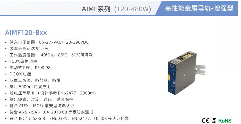 開關電源AIMF120-BxX, ?輸入電壓范圍:85-277VAC/120-390VDC ?效率最高可達 94.5% ?工作溫度范圍:-40℃to +85℃,60℃可滿載 ?150%峰值功率 ?主動式 PFC,PF≥0.98 ?DCOK功能 ?雙面三防漆、防鹽霧、防爆 ?滿足 5000m 海拔應用 ?過電壓等級川(設計參考 EN62477,2000m) ?輸出短路、過流、過壓、過溫保護 ?符合 ATEX、IECEx增安型防爆認證 ?符合ANSI/ISA71.04-2013G3等級防腐測試 ?符合IEC/