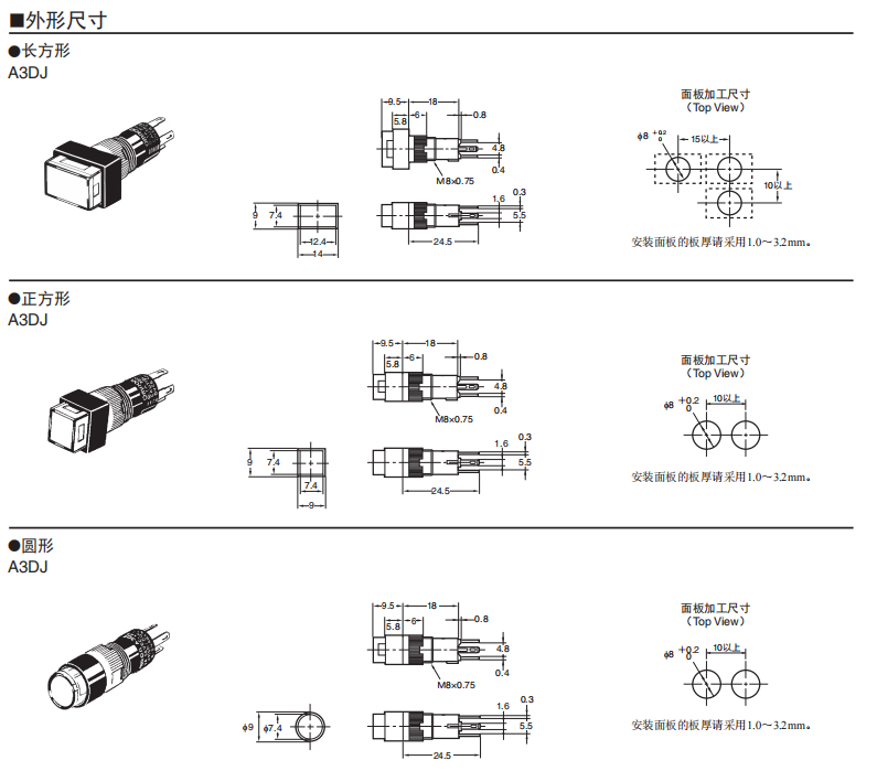 軀干長18mm、 圓軀干型f8系列 ●高亮度的均一表面發(fā)光。 ●圓形便于開孔。 ●形狀小巧,操作感好。