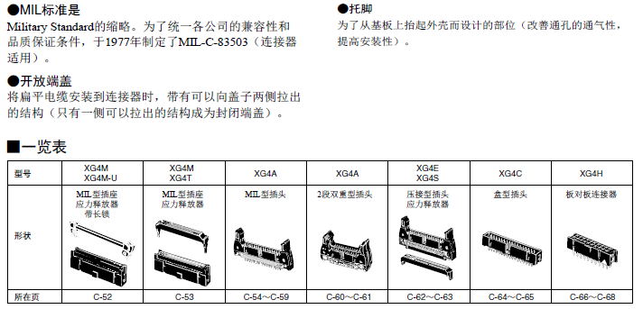 印刷基板連接器的核心、MIL規(guī)格標(biāo)準(zhǔn)品 通過采用新型生產(chǎn)力設(shè)計,高可靠性與低價格的同步實現(xiàn)。 備有便于省空間封裝的盒型插頭(XG4C)。 同時具有可進行中繼使用的壓接型插頭(XG4E)。 將本公司的散線壓接型連接器(XG5)特有插頭(XG8)與PCB型(XG2)組合使用可實現(xiàn)種類豐富的各種封裝。 適用本公司自己開發(fā)的簡易鎖定擺桿可以使特有插頭(XG8)和盒型插頭(XG4C)也能夠進行鎖定。 MIL規(guī)格(MIL-C-83503)標(biāo)準(zhǔn)。 標(biāo)準(zhǔn)品符合UL規(guī)格(File No. E103202)認(rèn)證產(chǎn)品。